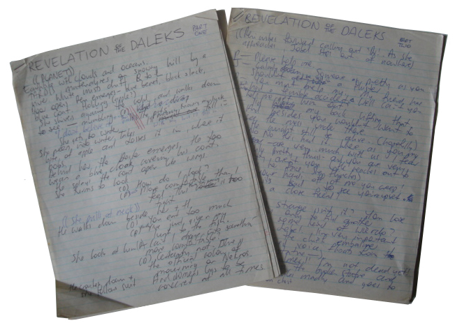 Novelising Revelation of the DaleksBy Paul ScoonesIn December 1988, after completing work on our novelisation of Shada, Jon Preddle and I made plans to adapt further ‘missing Targets’. We decided we would each novelise one Dalek story; I opted to do Resurrection of the Daleks which left Jon with Revelation of the Daleks. From beginning work on the transcript to completion of the typed manuscript Jon completed his adaptation of Revelation of the Daleks in less than six months. He had transcribed the story in early 1989 and wrote the first, handwritten draft during April and May 1989. Jon took the opportunity to add extra scenes in order to explain some of the plot holes, such as how the Daleks recognised the Sixth Doctor, and where the statue had come from. Jon finished the book whilst was suffering from a viral infection that kept him bed-ridden for two weeks. “Revelation is a dark story, full of death and misery, and the fact that I hand-wrote my adaptation with a red biro, and filled the descriptions with lots of blood and guts, was probably a reflection of my state of mind at the time!” he revealed.