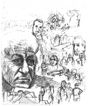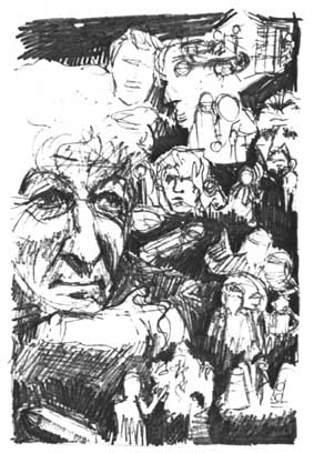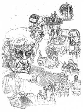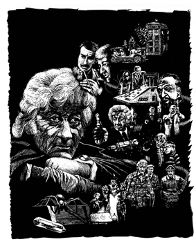 Hughes on ArtworkBy Alistair HughesSomething which illustrators or writers (and a host of other 'creative people') must sometimes regret (or perhaps it is a blessing?) is the opportunity to actually be present when their work is viewed and be able to describe the initial ideas and inspirations behind the finished article. Whenever I do get this opportunity, I'm always interested to find how knowledge of the concepts behind an illustration that I've done can alter someone's perception of it. The viewer either appreciates elements not immediately obvious in the artwork, or argues violently with me over what I'm trying to depict (when I've finally stopped rambling, that is). Either way, it's usually an interesting interchange of ideas. So, for these reasons, I'm going to take this opportunity to describe some of the artwork which I've submitted to TSV over the past year (in terms of the ideas involved and various techniques used) and hope like mad that this doesn't sound like a huge ego trip. The first illustration I submitted was actually the pencil sketch of Patrick Troughton shaking hands with Jon Pertwee which appeared on page 27 of TSV 12. However, I sketched this when I was 14 years old (and certainly looks it!) so I'll skip over this product of my misbegotten youth and turn to the back of that same issue (and the back of 13 and 15) for a look at the 'Pertwee Montage'. This was intended as a visual summary of the Third Doctor's career - in my humble opinion the Golden years of Doctor Who. The Pertwee era was full of action and fascinating alien creatures, but I decided to concentrate instead on human (and Time Lord) characters, and their relationships with the Doctor. I felt trying to obtain a good likeness of the Doctor, Brigadier or Jo would be more of a challenge than drawing Linx or the orange plastic bag from Claws of Axos. So the sequence begins at the top right of the illustration with the Third Doctor tumbling out of the TARDIS at the opening of Spearhead from Space and then then 'zig-zags' chronologically through the various companions, a certain enemy and characteristic situations to end with the 'Great One' and the Metebelis 3 crystal from Planet of the Spiders. Although one of my great aims was to avoid monsters, I included the Great One because spiders - oops, sorry 'Eight Legs' have such interesting, evocative shapes. I was very careful in choosing my reference material for this particular illustration, wanting to use situations and poses typical to particular characters, while also avoiding copying over-used publicity photographs. This meant that I sometimes had to make up scenes from mixtures of different pictures (the Doctor and Jo studying the TARDIS console is a prime example of this). The technique used for the 'Pertwee Montage' is scraperboard, which involves coating china clay-skimmed board with a layer of black Indian ink. When this has dried, the actual illustration is then scratched onto the ink with various types of styluses, exposing the white board beneath. Scraperboard is regarded as a 'dead technique' by many illustrators, because of the amount of time required makes it financially nonviable (and there's a constant threat of repetitive strain injury). I found it absorbing, however, but as much as I enjoyed working on it and driving my wife mad with four weeks scratching sounds, I have to admit that the result probably isn't too well suited to TSV because of the over-abundance of black. C'est la vie - we live and learn. I'd like, sometime in the future, to do a similar type of illustration for each of the Doctors - beginning with Tom Baker or perhaps Peter Davison, but I'll use less black this time! This item appeared in TSV 18 (May 1990). | |