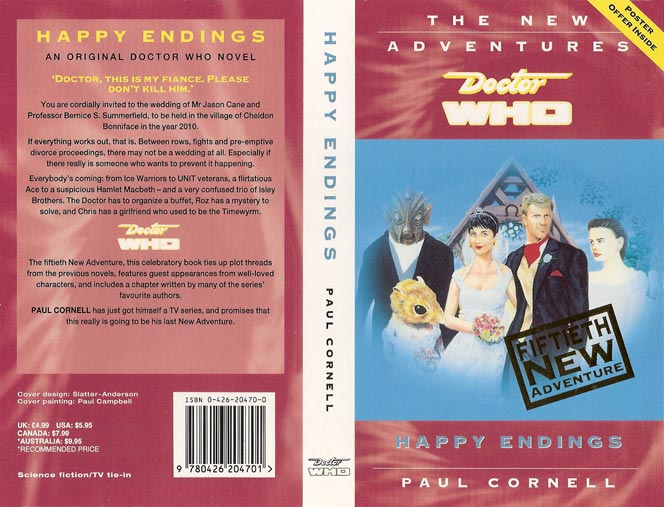 PC: Money. Oh, and the sheer fun of being allowed to do a romantic comedy. I submitted the idea for Happy Endings to Rebecca [Levene, Virgin's Doctor Who editor] as a joke, because we both like those issues of comics where the heroes get married. PS: So having submitted the idea as a joke, how did you feel when it was accepted? PC: Initially, a little nonplussed, because I wasn't sure if I could do it. Then I got into it and started to think of all the cool things I could do. PS: All but one of the New Adventures authors each wrote a short segment for Happy Endings. How did you go about the seemingly daunting task of coordinating so many writers to collaborate on one chapter? PC: It happened very quickly, really. Rebecca gave me a list of phone numbers for the ones I don't see down the Tavern [the Fitzroy Tavern, a regular meeting place in London for Doctor Who fans], and called a couple of real recluses herself. The hardest one to find was Andrew Hunt, who'd gone off to be a vet on a moor somewhere because of a bad review in TV Zone. I asked Jim [Mortimore] to contribute, but he didn't have time to, being much too big-time for us now. PS: The chapter reads remarkably smoothly, all things considered. How specific was your brief to each author? PC: I mentioned a buffet, a dress and a church hall. And I did a lot of little edits. PS: It has been said that you set yourself the task of 'solving' all of the New Adventures' continuity problems and tying up the loose ends in Happy Endings. How well do you think you achieved this? PC: I think I actually found there weren't that many problems. And I solved the ones that annoyed me, such as the eight twelves, the old TARDIS, Hemmings' name, etc. I do a lot of really tiny things too, like explain William Blake's odd religious beliefs in The Pit. PS: What degree of collaboration did you have with Dave Stone in creating the character of Jason Kane, Bernice's husband? PC: Dave and I swung about the corner of a bar at the Tavern, and we had a few phone conversations. I wanted Jason to be more like Kenneth Branagh, but he's wholly Dave's character as he stands. PS: Two of your novels feature the old Ace and two feature the new version. Which do you prefer writing for and why? PC: Well, there is the Old, the New, and the Newest, and, of those, I prefer the Newest, because she's finally grown up, and got through that weird kiddie phase of thinking that guns and bombs are cool. Good to have followed her all that way. PS: At which point did you decide to adopt the 'English Seasons' motif for your New Adventures? PC: At the end of Love and War, because I just realised that it was going to fit. There are quite a few things that unite the four books, like the snowflakes and the owls. I really like series that have only obscure links. PS: How much involvement do you have in determining the cover paintings of your books? PC: Revelation: they asked what scene I wanted on it. Love and War: I sketched the cover on a napkin and asked for Lee Sullivan. No Future: I compromised on what was going on (I wanted Stonehenge), and they gave me the choice of Pete Wallbank or another artist. And, Pete being a mate... he has since said that he's sorry, but I don't quite believe him yet. Goth Opera: Quick discussion about the castle and Nyssa, Alister [Pearson] was everybody's choice and was kind enough to send me a print. Human Nature: selected the scene, and heard lots of raves about the artist. I quite like it. Happy Endings: I really wanted a group photo, and went to the extent of actually plotting out who should be standing where. The artist did a fabulous job in those horrible circumstances. PS: Many of your characters appear to be named after people you know. To what extent do these characters generally reflect their real-life namesakes? PC: Some do, some don't. Usually, I only name a character after somebody I know when a reader who didn't know anything about fandom would just wander straight past it and not notice. Major characters aren't usually named after real people. Maire and Roisa in Love and War were characterised after two mates of mine, but not under their real names. Matthew in Goth Opera was going to be called Steve, until Rebecca pointed out that I'd given him Steve Lyons' house! PS: The archaeologist Paul Magrs in Love and War is for me a particularly memorable character. Is he named after, or perhaps even based on, the author of the novels Marked for Life and Does it Show, whom, like yourself, was educated at Lancaster University? PC: Absolutely! We were in the same class doing the Writing MA at Lancaster. He's a very good writer who had an NA turned down as I was writing Love and War, but stuck it out and eventually got accepted as a very literary author. He was writing Does it Show at Lancaster. PS: How easy is it for you, an established Doctor Who author, to get a New or Missing Adventure proposal commissioned? Have you had many proposals rejected? PC: I've had one actual rejection. My second submission, Souleye, an Autons vs. UNIT story, was turned down, and bits appeared in No Future. But I'm fortunate in that I can get a potential rejection over in a couple of minutes, because I know Rebecca quite well, so if I outline a silly idea, she can just stop it there and then. Indeed, Rebecca rejects me all the time. I still have to try very hard. We all do. PS: As a former fan fiction writer yourself, what are your feelings on the growing trend of fan fiction based on the New Adventures? PC: It's wonderful to set up a paradigm and see other people play with it. There was some cool NA fiction in TSV recently, and some more in Skaro. I'm starting to see it all over the place. Hopefully, the forthcoming Benny books will provide a voice for this sort of stuff after the license goes. PS: As the creator of Bernice Summerfield, how much input are you having in the setting up of this new series from Virgin? PC: There's a conference being held this Thursday [11 Jul